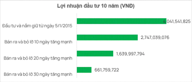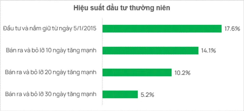 Nhiều nhà đầu tư tin rằng họ có thể bán ra khi thị trường giảm và mua lại khi giá thấp hơn, một chiến lược có thể gọi là hoàn hảo. Nhưng trên thực tế, xác suất để thực hiện thành công điều này gần như bằng không, và nỗ lực thoát khỏi thị trường để tránh các phiên giảm điểm thường khiến nhà đầu tư đối mặt với một rủi ro lớn hơn – đó là bỏ lỡ những phiên phục hồi quyết định đến lợi nhuận dài hạn. Hiện tượng này được gọi là “missing the best days” – bỏ lỡ những ngày tốt nhất.
