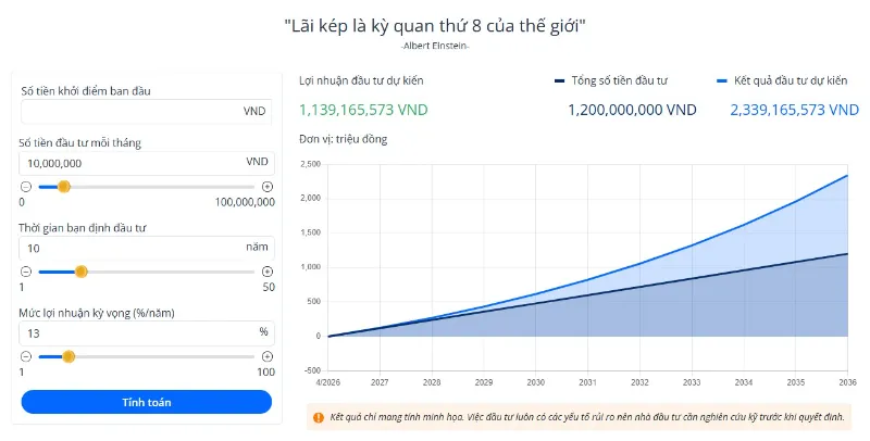 Minh họa về sức mạnh của lãi kép bởi công cụ tính lãi kép Ftool trên Fmarket.