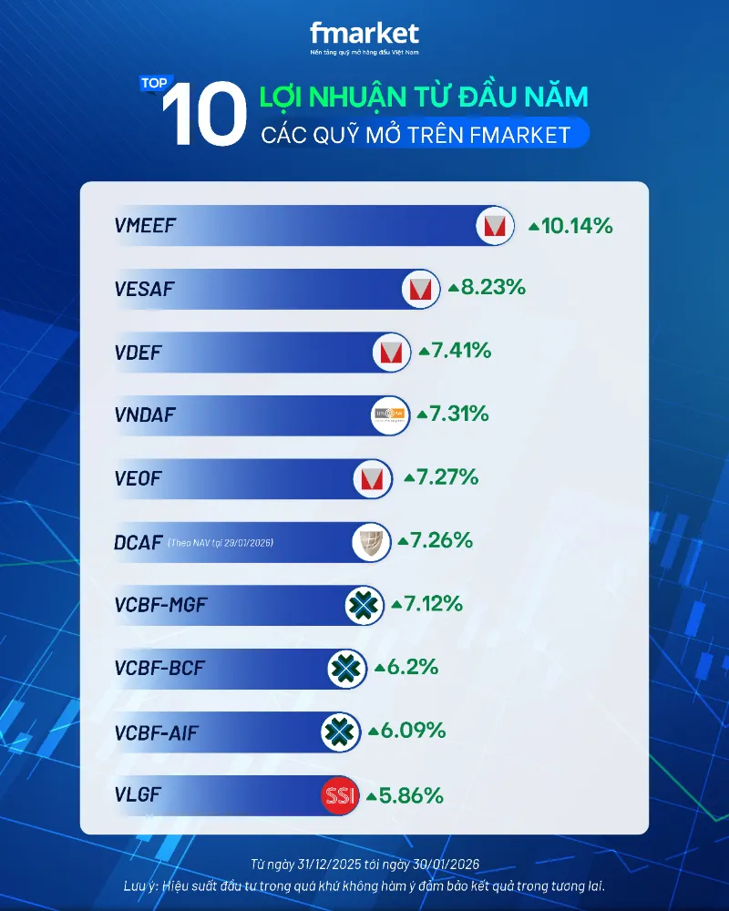 VinaCapital và VCBF "góp mặt" 7/10 quỹ mở có hiệu suất tốt nhất tháng 01/2026. Ảnh: Fmarket