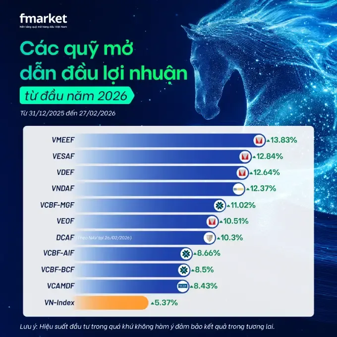 Nhóm quỹ do VinaCapital quản lý như VMEEF, VESAF và VDEF đang dẫn đầu hiệu suất từ đầu năm với mức tăng từ 12–14%, trong khi VEOF cũng vượt mốc 10%. Xét danh mục tháng 1/2026, VMEEF và VESAF có nhiều điểm tương đồng khi cùng nắm giữ các cổ phiếu lõi như MBB, BVH, FPT, PNJ, CTG, GMD, MWG, ACB và HPG; dù tỷ trọng phân bổ khác nhau tùy theo định hướng chiến lược của từng quỹ.