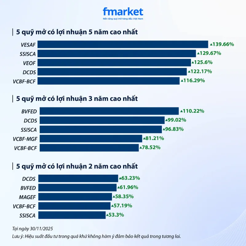 Một số quỹ mở có chiến lược năng động như DCDS, BVFED hay MAGEF đã tận dụng tốt các cơ hội nắm bắt sóng tăng, vươn lên dẫn đầu ở mốc lợi nhuận từ đầu năm. Số liệu từ Fmarket, nền tảng đầu tư quỹ mở lớn nhất Việt Nam, các quỹ có lợi nhuận tốt nhất ở mốc thời gian này bao gồm: quỹ BVFED đạt lợi nhuận 34,06%, DCDS: 26,68%, MAGEF: 24,85%; ngoài ra 2 quỹ khác của MB Capital cũng đạt hiệu suất tốt từ đầu năm là quỹ BMFF với lợi nhuận 24,5 % và MBVF 21,32% (tại ngày 30/11/2025).