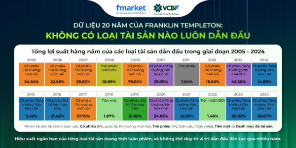 Dữ liệu của Franklin Templeton cho thấy sự biến động này rất rõ trong giai đoạn 2005–2024. Có năm, cổ phiếu thị trường mới nổi ghi nhận mức tăng trưởng trên 79%, song chỉ một năm trước đó lại giảm hơn 50%. Tương tự, có thời điểm cổ phiếu tăng trưởng vốn hóa lớn đứng đầu, nhưng ngay năm sau vị trí này được thay thế bởi trái phiếu hoặc tiền mặt USD. Những biến động này khẳng định một nguyên lý quan trọng: hiệu suất ngắn hạn của từng loại tài sản mang tính luân phiên, và không thể duy trì vị trí dẫn đầu liên tục qua nhiều năm.